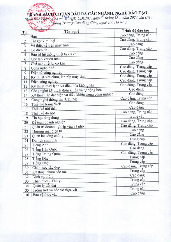 QUYẾT ĐỊNH: Ban hành chuẩn đầu ra các ngành, nghề đào tạo 05 Tháng Sáu, 2024Trường Cao đăng Công nghệ cao Hà Nội ban hành quyết định số 873/QĐ-CĐCNC Hà Nội ngày 04/06/2024 về việc ban hành chuẩn đầu ra các ngành, nghề đào tạoChi tiết chuẩn đầu ra các ngành nghề đào tạo xem tại đây: Hải Đinh 5 Tháng Sáu, 2024