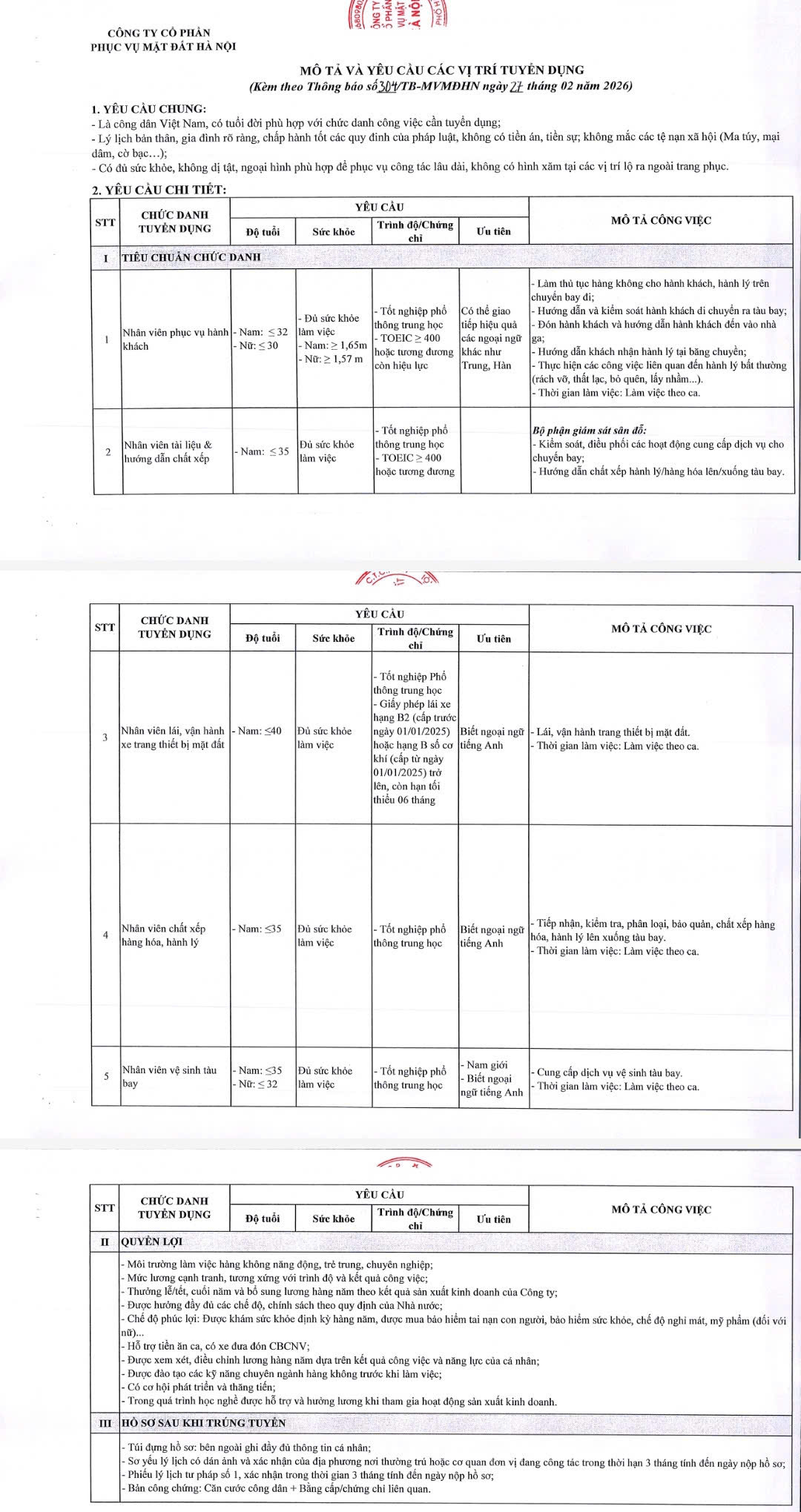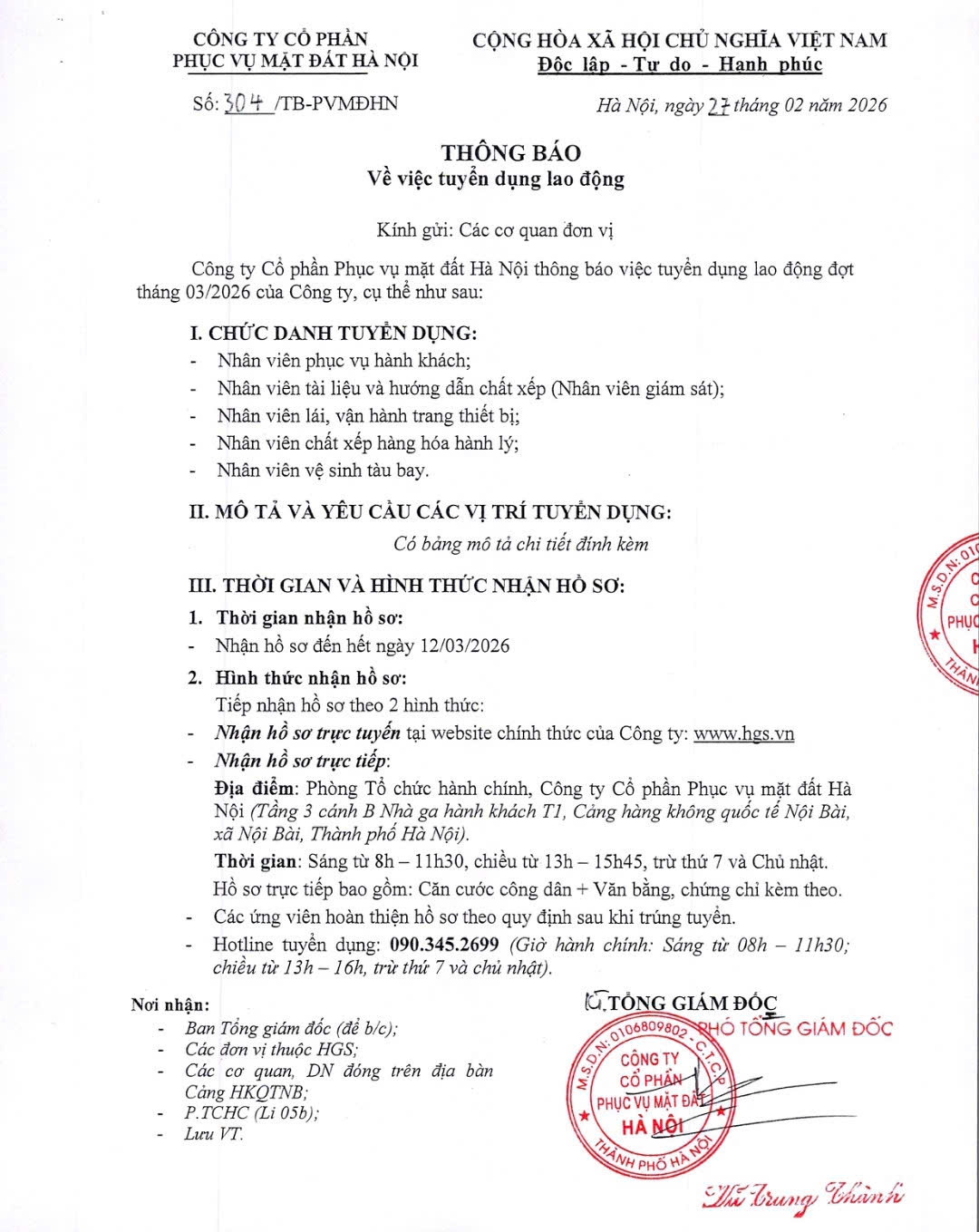 Công ty Cổ phần phục vụ mặt đất Hà Nội thông báo tuyển dụng. 04 Tháng Ba, 2026 Mai Chi Cuong 4 Tháng Ba, 2026