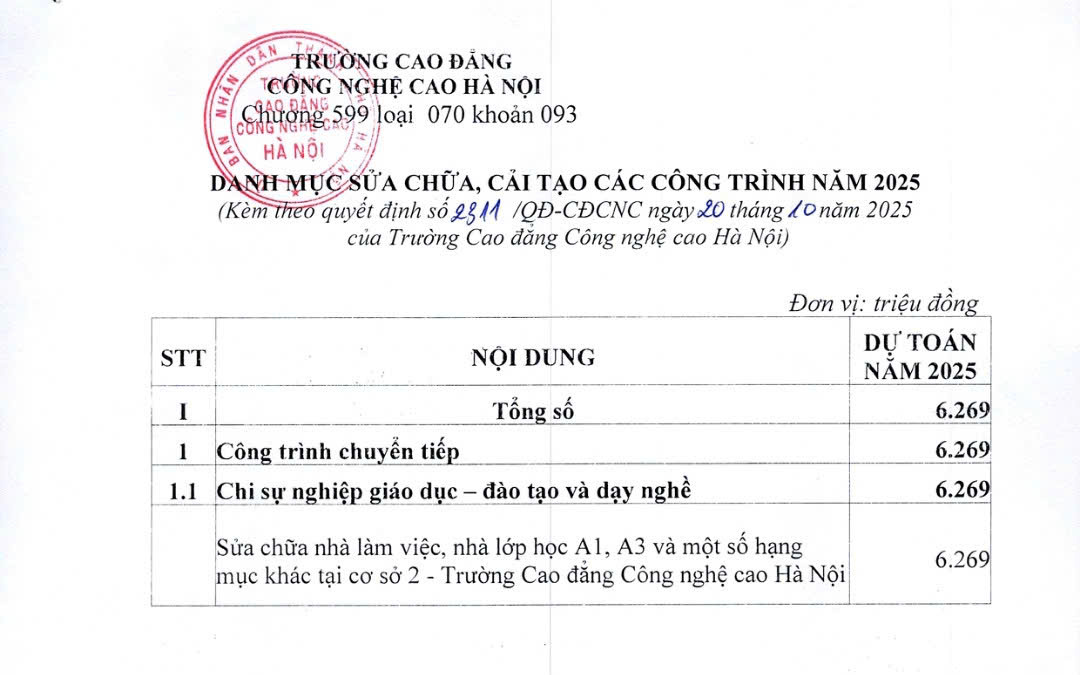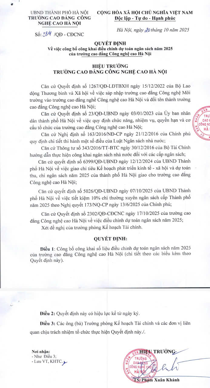 Quyết định số 2062/QĐ – CĐCNC v/v phê duyệt kết quả lựa chọn đối tác liên kết khai thác sử dụng tài sản công phục vụ đào tạo, dịch vụ của Trường Cao đẳng Công nghệ cao Hà Nội năm 2025 tại vị trí nhà A6 diện tích 105m2 CS2.