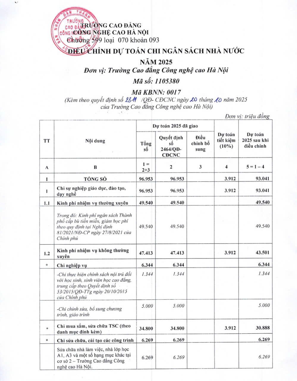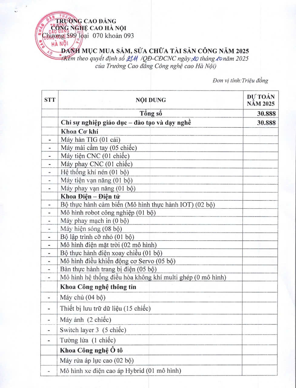 Quyết định số 2056/QĐ – CĐCNC v/v phê duyệt lựa chọn đối tác liên kết khai thác sử dụng tài sản công phục vụ hoạt động đào tạo, dịch vụ của Trường Cao đẳng Công nghệ cao Hà Nội năm 2025 tại vị trí tầng 2 nhà E và nhà A5 diện tích 465m2 CS2.