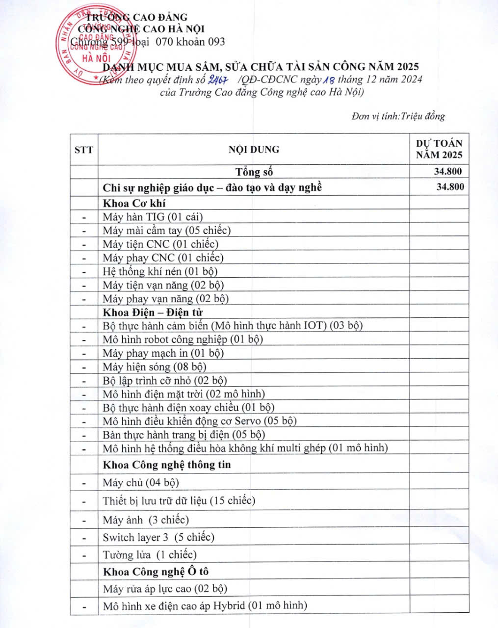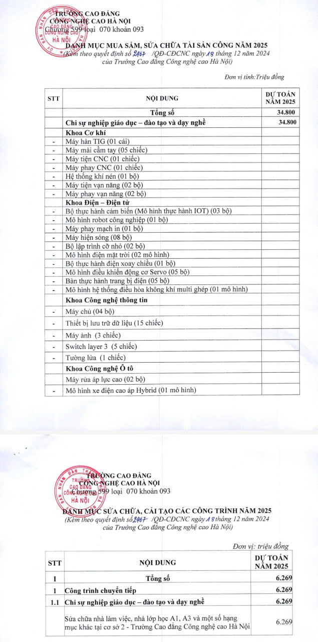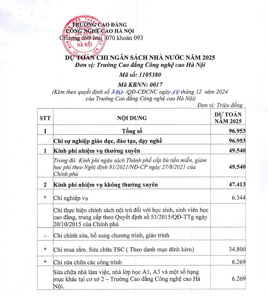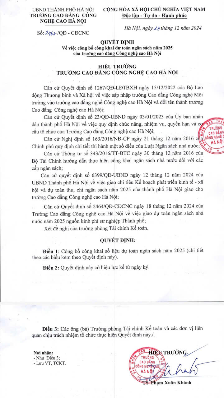QĐ số 1376/QĐ – CĐNCNC về việc công khai dự toán thu chi ngân sách năm 2023.