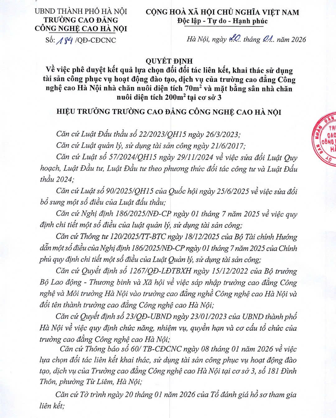 Quyết định số 184/QĐ – CĐCNC v/v phê duyệt kết quả lựa chọn đối tác liên kết, khai thác sử dụng tài sản công phục vụ hoạt động đào tạo, dịch vụ của Trường Cao đẳng Công nghệ cao Hà Nội nhà chăn nuôi diện tích 70m2 và mặt bằng sân nhà chăn nuôi diện tích 200m2 tại CS3.