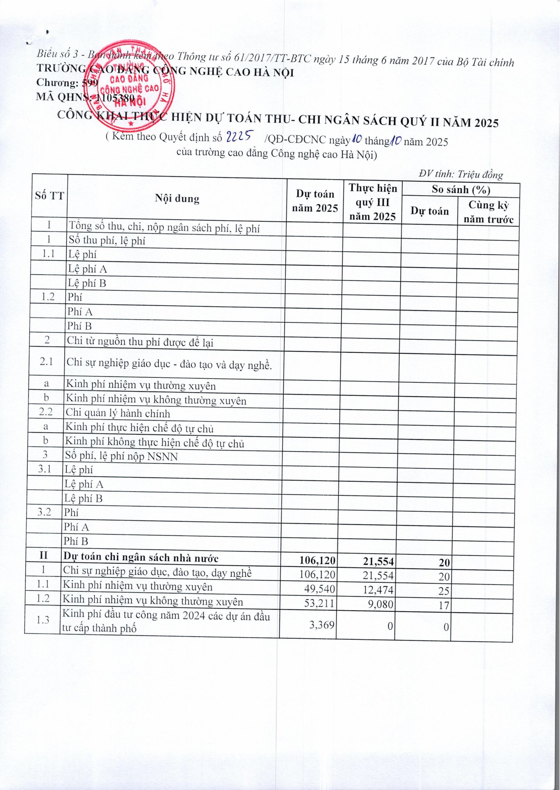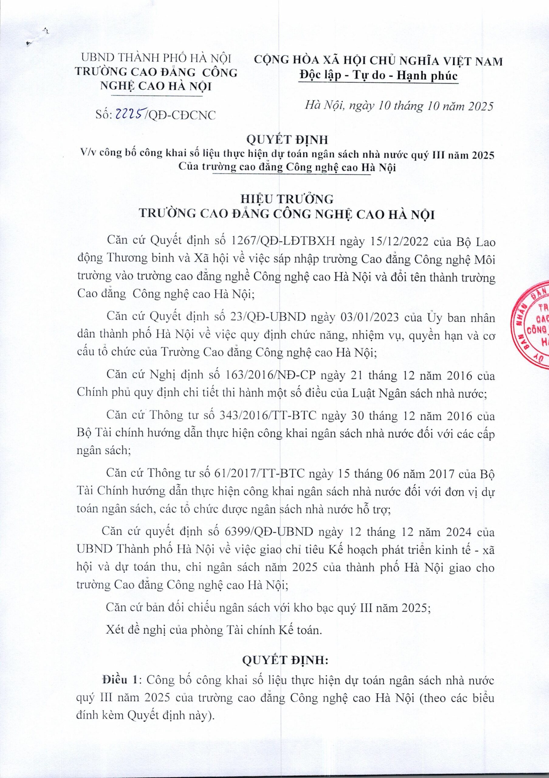 Quyết định 2467/QĐ – CĐCNC về việc công bố công khai dự toán ngân sách năm 2025.
