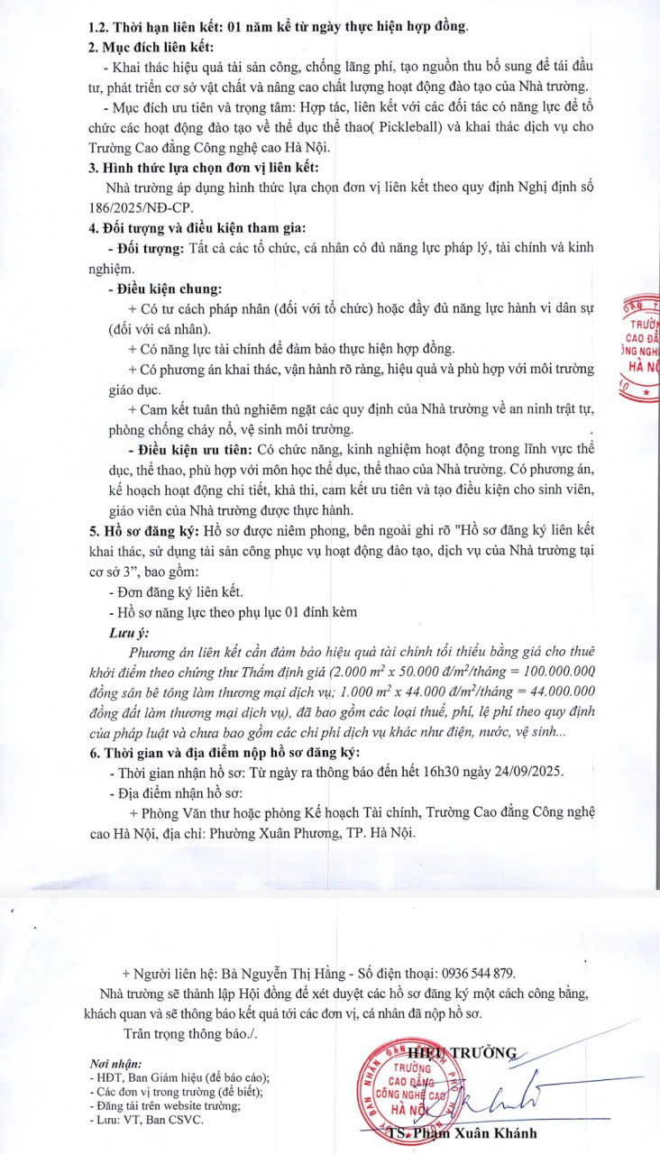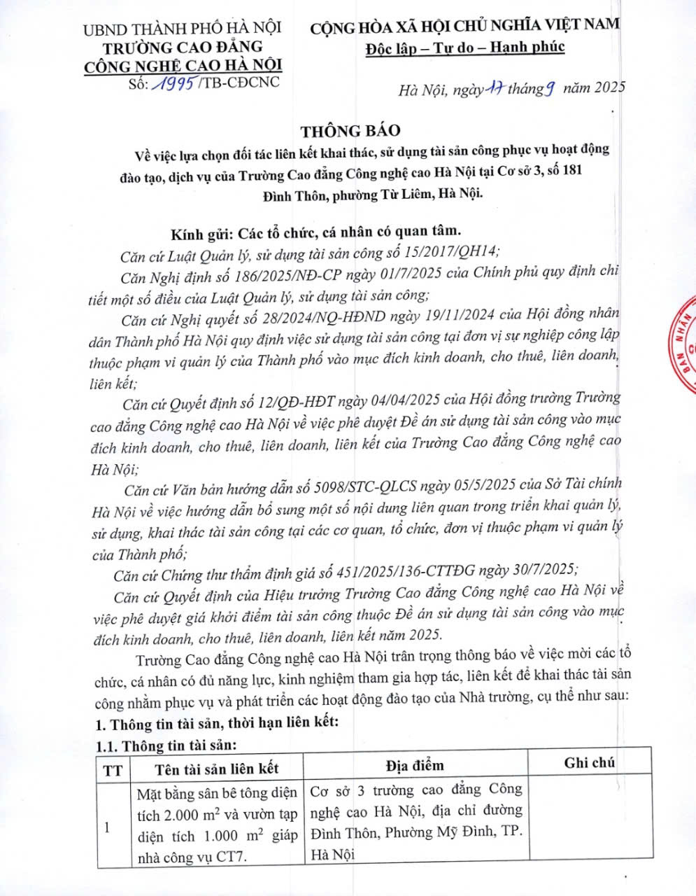 Thông báo số 1995/TB – CĐCNC v/v lựa chọn đối tác liên kết khai thác, sử dụng tài sản công phục vụ hoạt động đào tạo, dịch vụ của Trường Cao đẳng Công nghệ cao Hà Nội tại CS3, số 181 Đình Thôn, phường Từ Liêm, TP. Hà Nội.