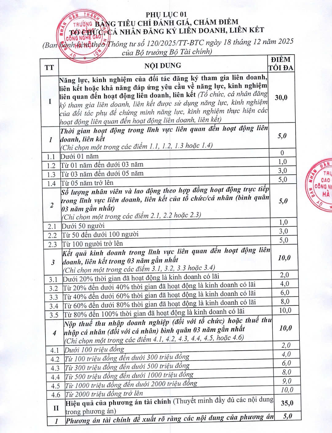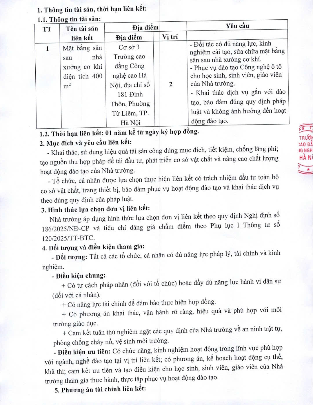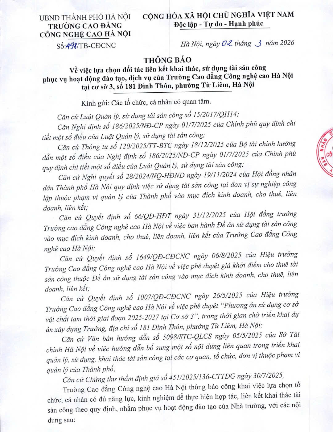 Quyết định số 184/QĐ – CĐCNC v/v phê duyệt kết quả lựa chọn đối tác liên kết, khai thác sử dụng tài sản công phục vụ hoạt động đào tạo, dịch vụ của Trường Cao đẳng Công nghệ cao Hà Nội nhà chăn nuôi diện tích 70m2 và mặt bằng sân nhà chăn nuôi diện tích 200m2 tại CS3.