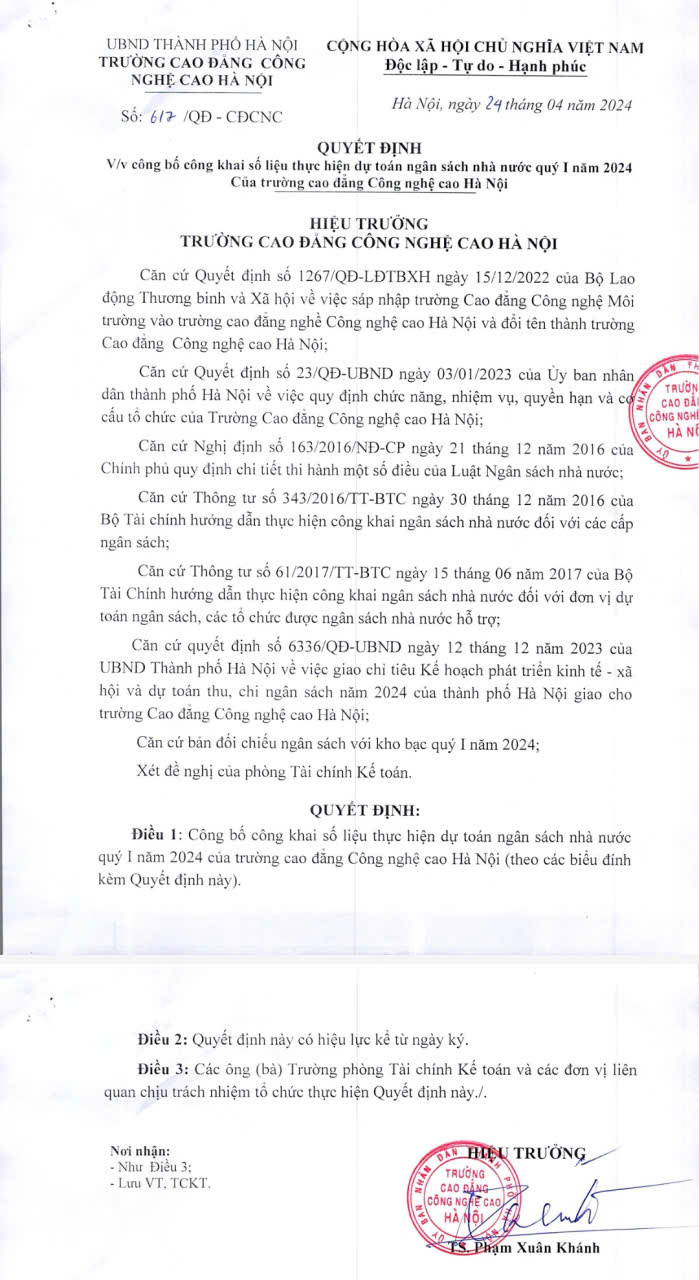 Quyết định số 2054/QĐ – CĐCNC v/v phê duyệt kết quả lựa chọn đối tác liên kết khai thác sử dụng tài sản công phục vụ hoạt động đào tạo, dịch vụ của Trường Cao đẳng Công nghệ cao Hà Nội tại vị trí tầng 3, tầng 4 nhà E (diện tích 525m2 CS2).