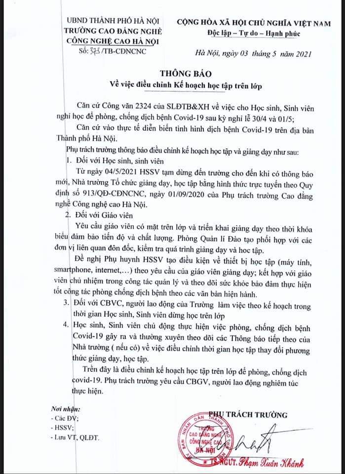 Trường Cao đẳng nghề Công nghệ cao Hà Nội ban hành Thông báo số 373/TB – CĐNCNC thông báo về việc điều chỉnh Kế hoạch học tập trên lớp: