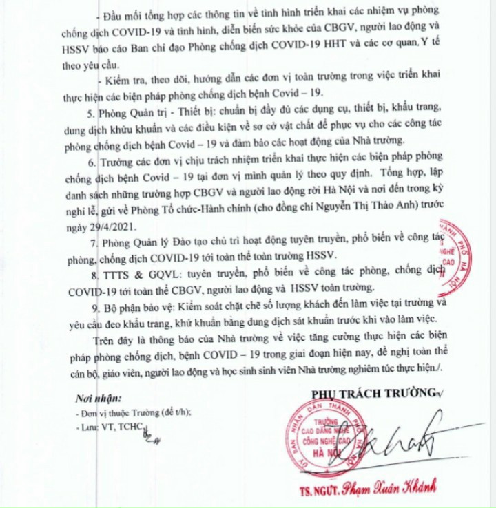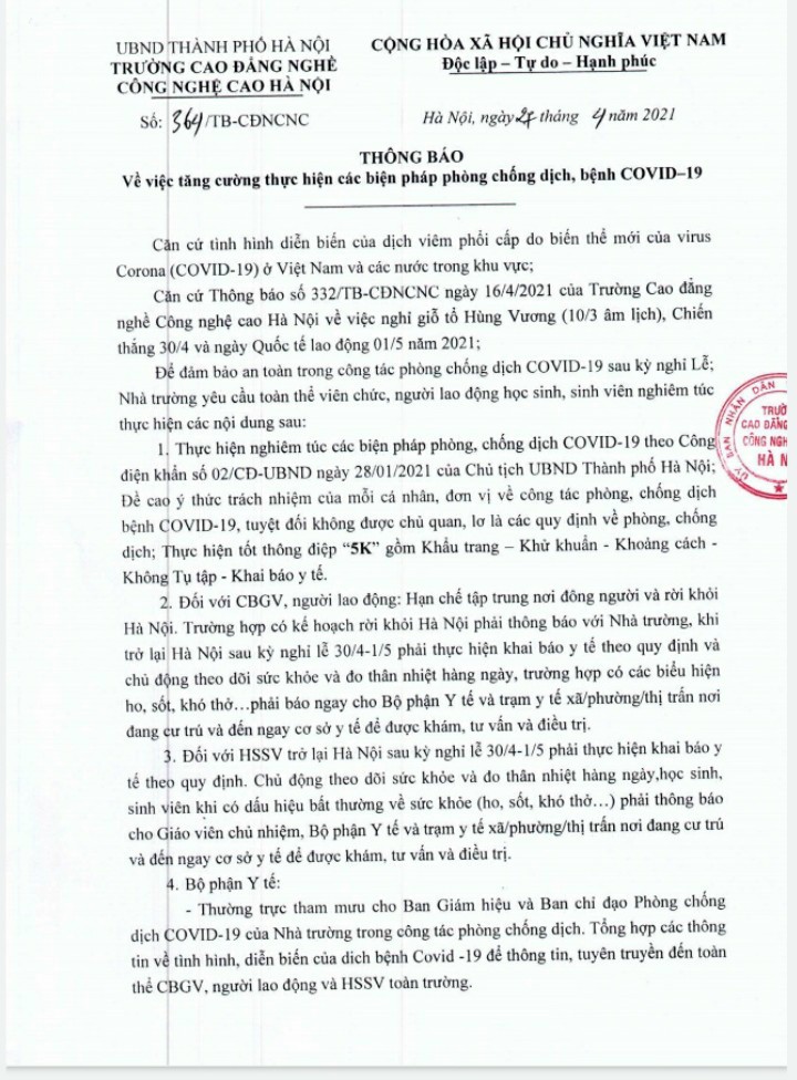 Thông báo về việc tăng cường các biện pháp phòng, chống dịch bệnh Covid – 19. 28 Tháng Tư, 2021Cán bộ, giáo viên, HSSV khai báo y tế tại đường link sau: https://tokhaiyte.vn/Văn bản: Phòng TCHC (cung cấp). Mai Chi Cuong 28 Tháng Tư, 2021