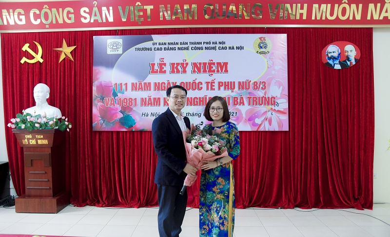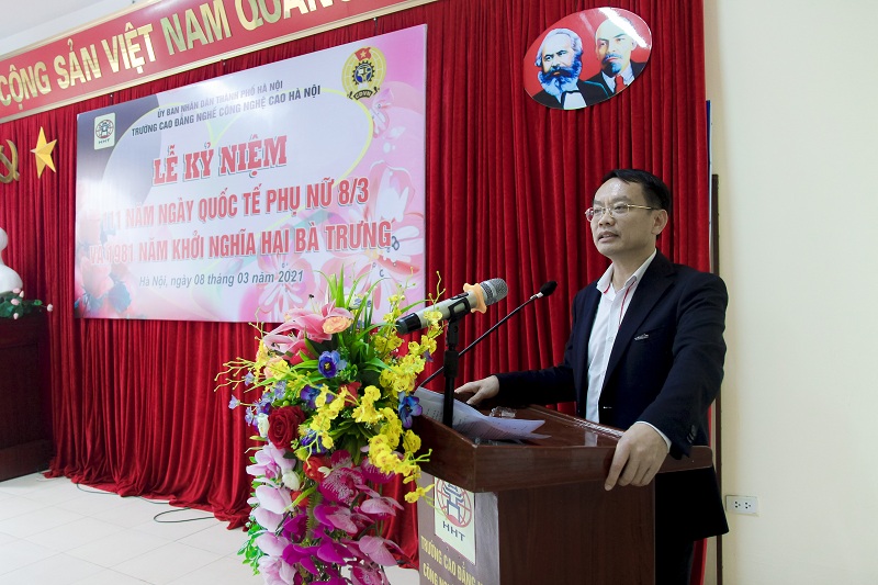 Phát biểu buổi lễ, NGƯT. TS. Phạm Xuân Khánh bày tỏ sự quan tâm và gửi lời chúc tốt đẹp đến các nữ cán bộ, giáo viên của Nhà trường. Với trách nhiệm trong gia đình, người phụ nữ luôn có vai trò “giữ lửa” tổ ấm nhưng trong công việc các cán bộ nữ luôn hoàn thành tốt nhiệm vụ của Trường. Sự hình thành và phát triển Nhà trường có sự đóng góp không nhỏ của các cán bộ nữ trong công tác đào tạo, nghiên cứu và quản lý, hành chính. Hiệu trưởng hy vọng hoạt động nữ công Trường Cao đẳng nghề Công nghệ cao Hà Nội tiếp tục được phát huy, góp phần tích cực vào sự phát triển chung của hoạt động Nhà trường.