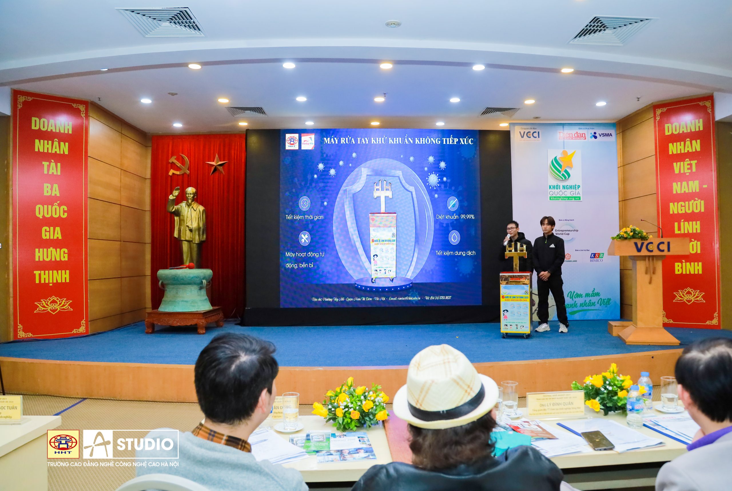 Vượt qua hơn 600 sản phẩm sáng tạo khởi nghiệp, và lọt sâu vào top 10 sản phẩm xuất sắc có triển vọng có thể gọi vốn. Đêm ngày 08/01/2021 trong khuôn khổ chương trình Festival Khởi nghiệp 2021 do Tạp chí Diễn đàn Doanh nghiệp tổ chức dưới sự chỉ đạo của Phòng Thương mại và Công nghiệp Việt Nam (VCCI), Đêm chung kết cuộc thi Sáng tạo khởi nghiệp Quốc Gia 2021 đã diễn ra với sự góp mặt của Sản phẩm mang thương hiệu trường Cao đẳng nghề Công nghệ cao Hà Nội Máy rửa tay sát khuẩn không tiếp xúc thu hút sự quan tâm của nhiều doanh nghiệp và HSSV trên toàn quốc.