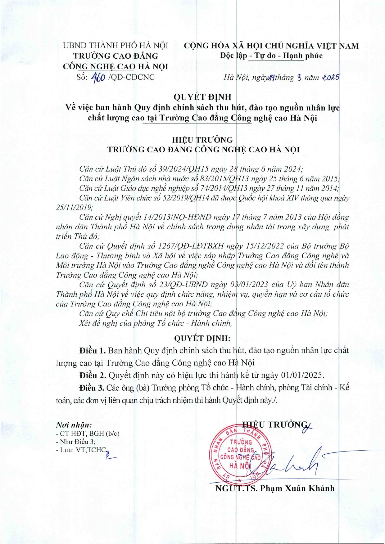 Ngày 19 tháng 03 năm 2025, Hiệu trưởng Trường Cao đẳng Công nghệ cao Hà Nội đã ký ban hành Quyết định số 460 / QĐ-CĐCNC về việc ban hành Quy định chính sách thu hút, đào tạo nguồn nhân lực chất lượng cao tại Trường Cao đẳng Công nghệ cao Hà Nội.