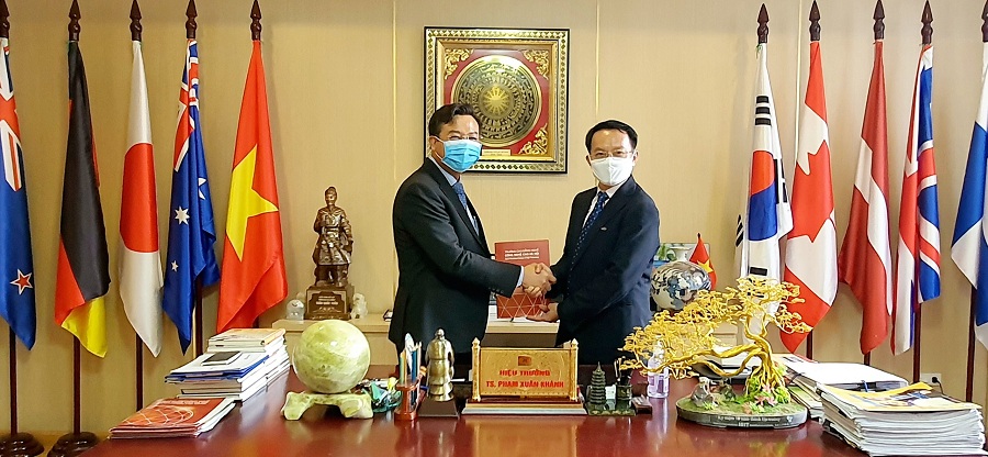 Ông Vũ Duy An – Phó TGĐ Bảo Sơn Group và NGƯT.TS Phạm Xuân Khánh – Phụ trách trường thực hiện kí kết Biên bản ghi nhớ hợp tác đào tạo.