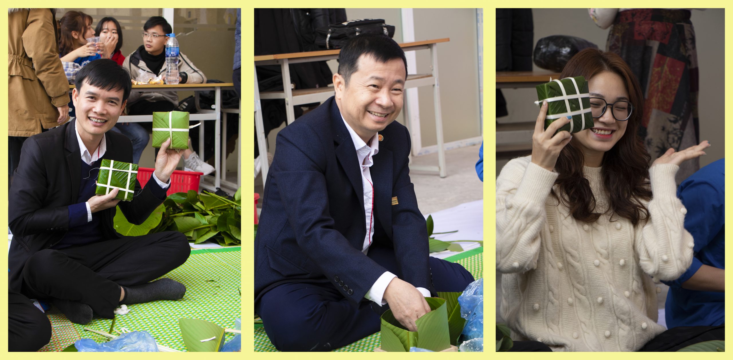 Nhiều Cán bộ cũng tích cực tham gia hoạt động gói bánh: Ths. Ngô Minh Nhật – Trưởng Khoa Cơ khí (trái cùng); Đ/c Nguyễn Yên Thắng – Chủ tịch Công đoàn – GĐ TT TS & GQVL HHT (Giữa); Tieu Ngoc – Chuyên viên Tuyển sinh.