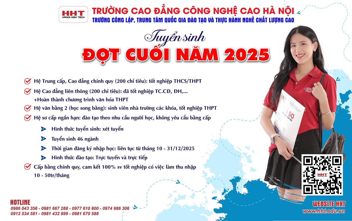 Trường Cao đẳng Công nghệ cao Hà Nội (HHT) tiếp tục nhận hồ sơ xét tuyển (đợt nhập học cuối cùng) năm 2025.